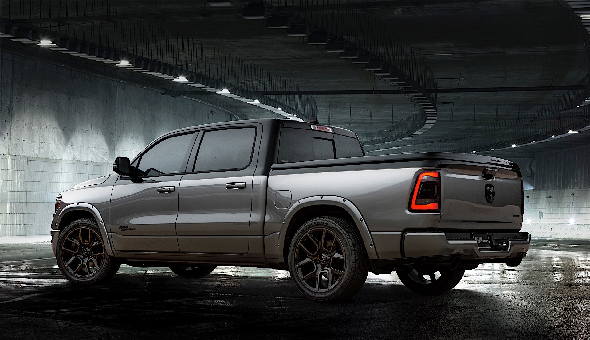 The truck has a Mopar conceptual performance hood, 22-inch oversized production wheels that are colored in Gloss Black with Brass Monkey accents, and has concept wheel flares. A one-piece tonneau cover and 5-inch exhaust tips are also body-colored Gloss Black.