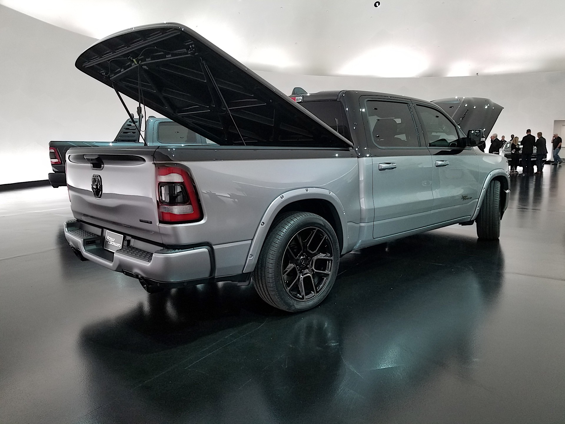 A conceptual Ram Bar in the bed, first seen on the Rebel TRX Concept truck, acts as a mounting location for 5-inch LED lights. Also in the bed is a concept spare tire carrier, Mopar bed step, and a black spray-in bedliner.