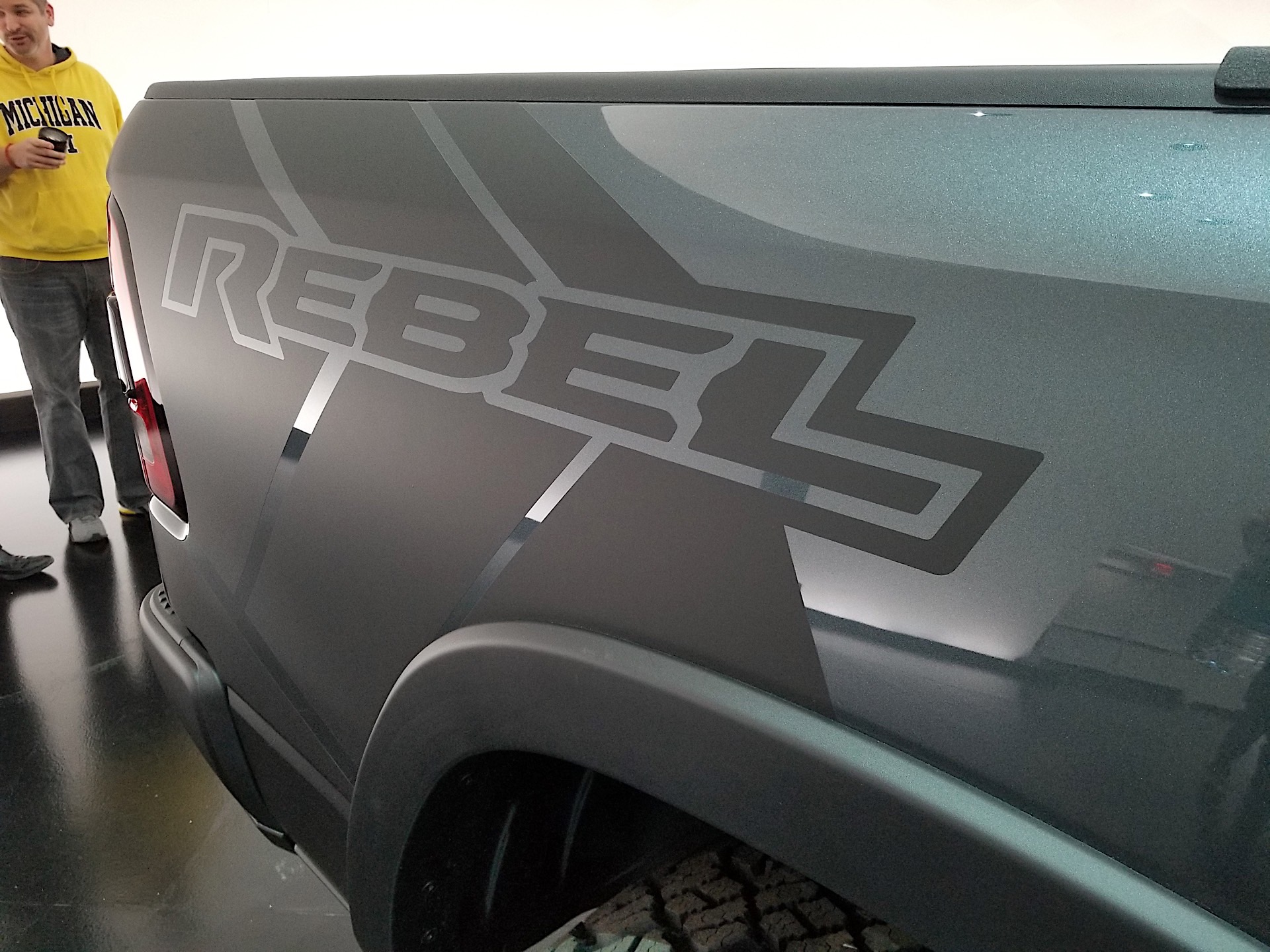 Special satin black Rebel graphics add a subtle touch to the exterior bed sides, and the exhaust tips are also 5-inch units in Gloss Black.