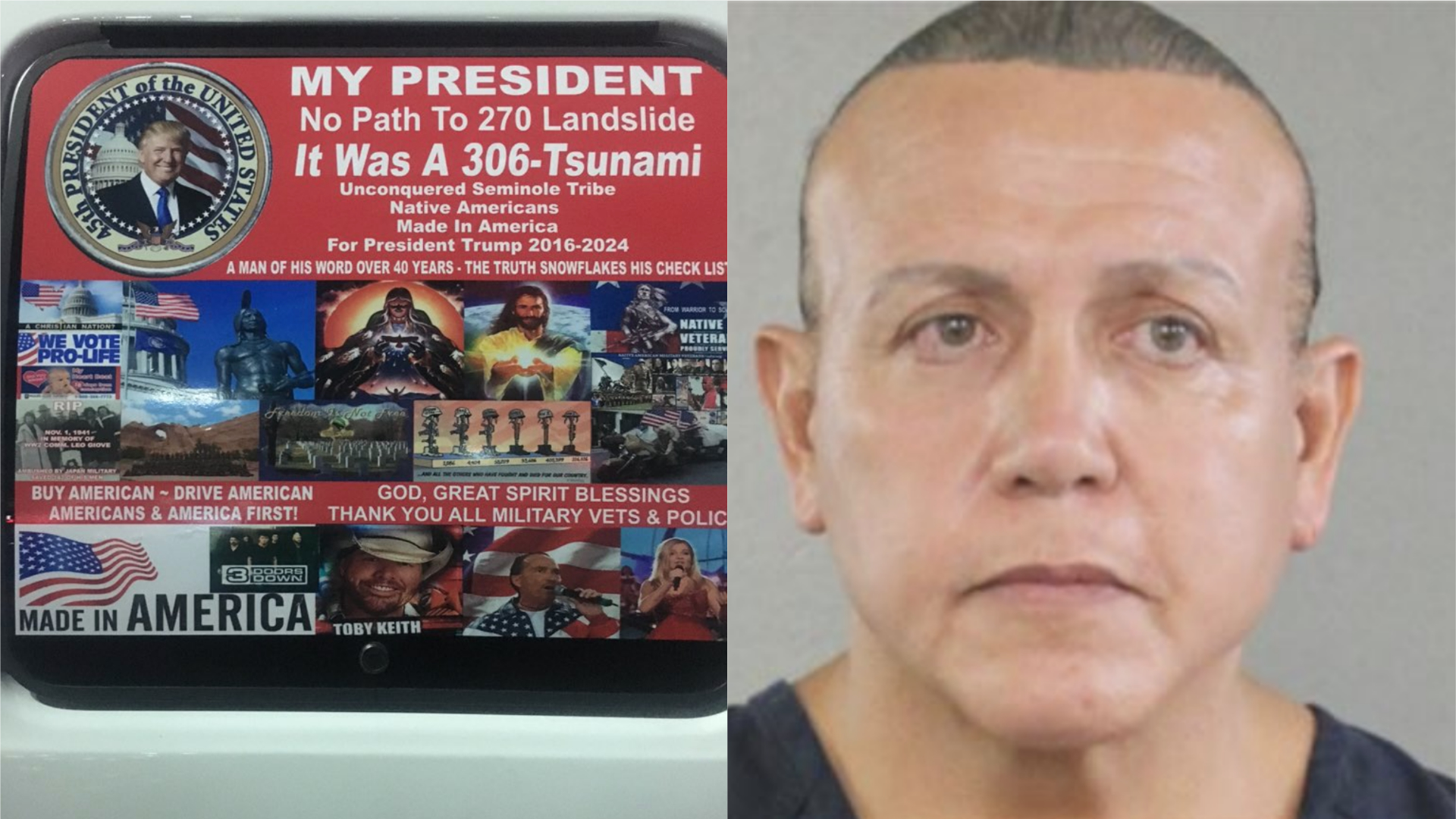 A van owned by the suspect, plastered in political stickers, was seized at the time of the arrest. It was covered in a blue tarp before being loaded onto a trailer for thorough examination at an FBI facility.