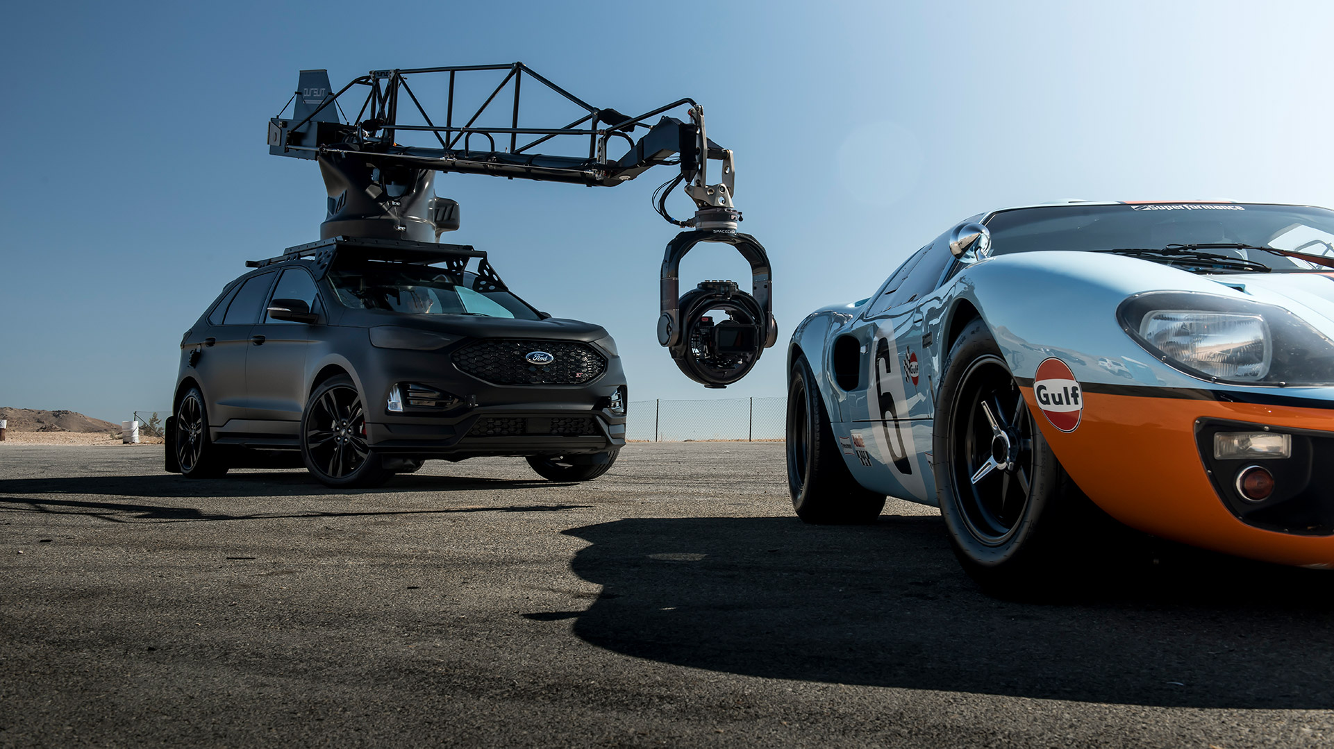 Working with Ford, Pursuit Systems modified a new 2019 Ford Edge ST to become the ideal camera car. What makes it ideal? The cars need to be quick. Pursuit Systems needs vehicles that can go over 100 mph and the Edge ST gets up to 130 mph, makes 335 horsepower with 380 pound-feet of torque. It also has high performance brakes, which are important for slowing down the vehicle with a 1,000-pound mounted crane attached to the roof.