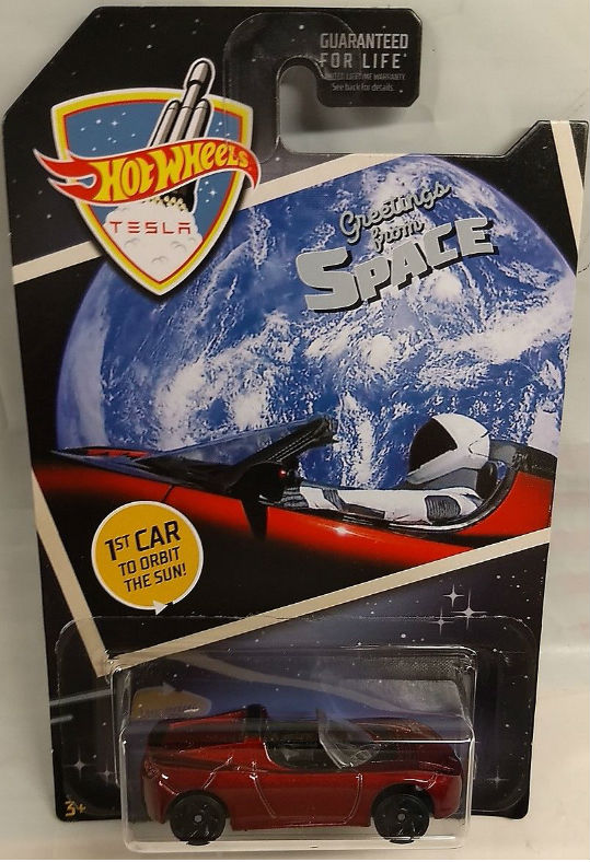 The packaging for the toy features a photo of the actual car as seen during the original live stream, with fun quotes like “Greetings from SPACE!” and “1st car to orbit the sun!”
