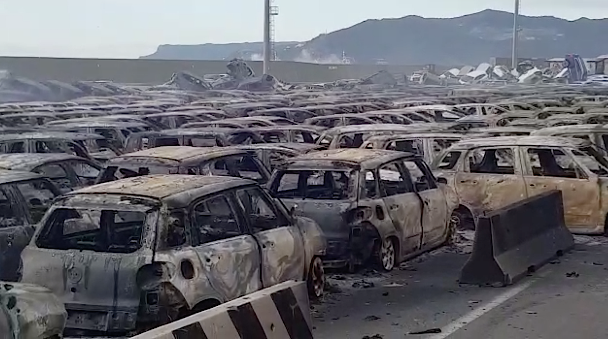 The Port of Savona remains closed, two days later, because occasional explosions are still happening from the damaged batteries. Needless to say, the cars aren’t going to be catching their ride to the Mideast.