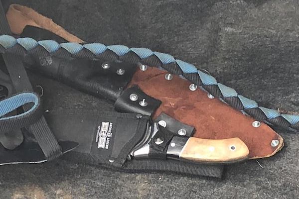 Multiple modified baseball bats were found in the vehicle, one with two circular saw blades bound around the barrel, the other encrusted in bottle caps. A plethora of knives, a flag that appears to have been fashioned into a spear, and a club were also present.