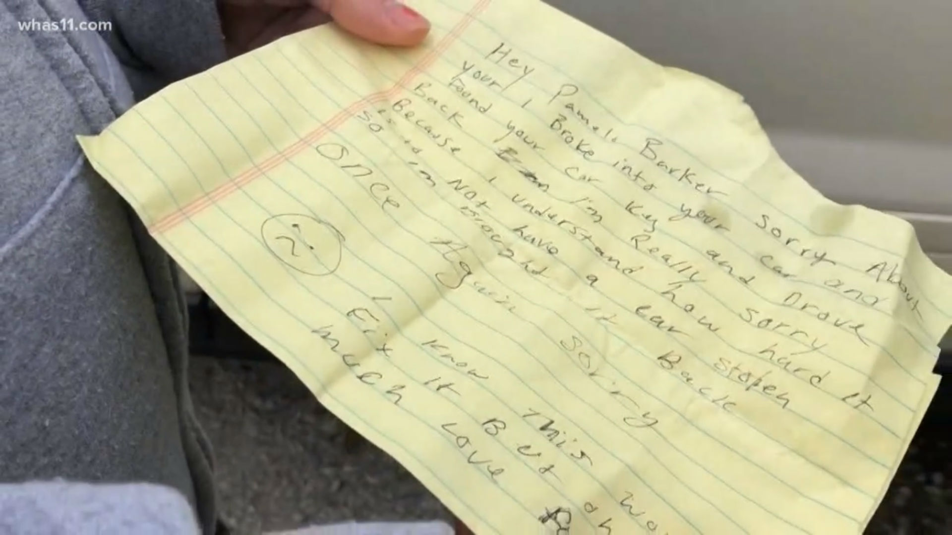 The note reads, “Sorry about your car. I broke into your car and found your car keys and drove. I’m really sorry because I understand how hard it is not to have a car so I brought it back. Once again sorry. I know this won’t fix it but oh well. Much love for you.”