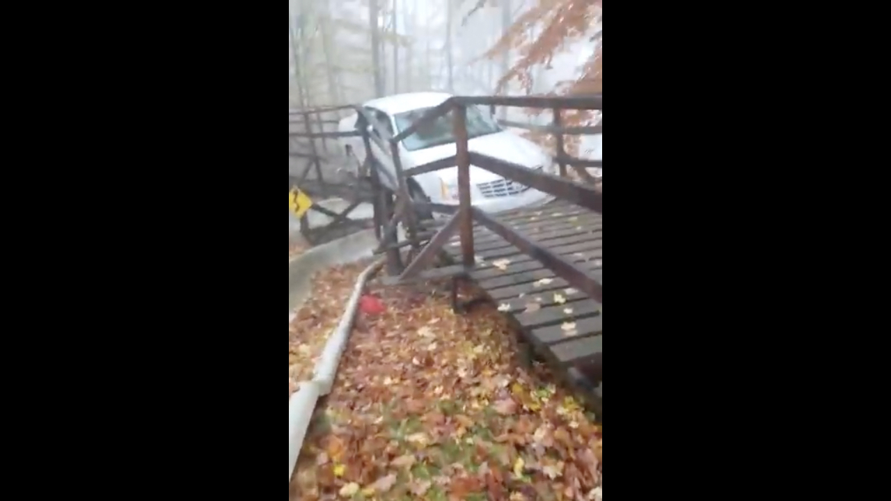 The driver of a Cadillac DTS plunged through a pedestrian bridge on a Mount Brome trail in Quebec, Canada, leaving them stuck headfirst for hours before local authorities came to rescue them