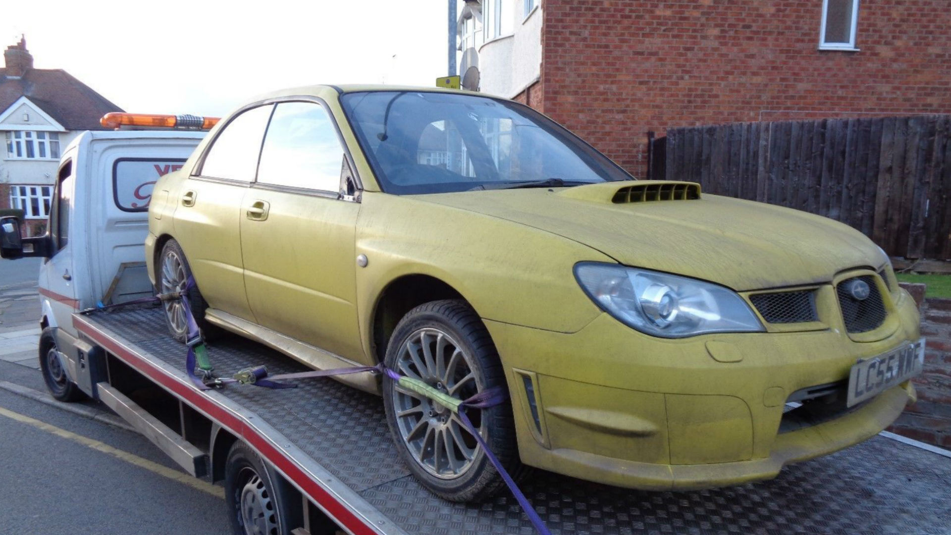 Yes, that’s the typical Subaru boxer engine sitting beneath the Impreza’s trunk lid. Apart from being backward, the car is a somewhat ordinary UK-spec right-hand-drive WRX. As a stunt car, it’s had much of the interior stripped and a roll-cage installed. The car also has a rear-facing “driver’s seat” and a dummy steering wheel at the back.