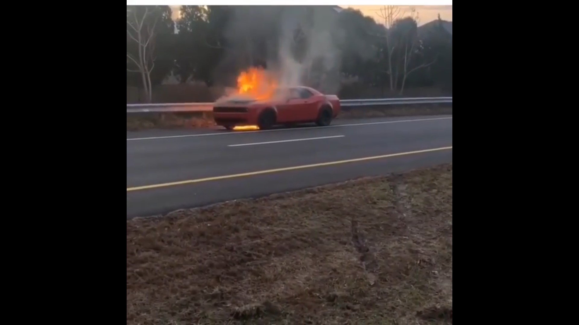 One Dodge Challenger SRT Demon channeled its namesake this past Sunday, going up in flames in spectacular fashion until most of its front end was nothing but char. Despite what you might be assuming, this factory drag racer didn’t burn up at the dragstrip or a racetrack but on the shoulder of a public highway. Thankfully, no injuries have been reported.