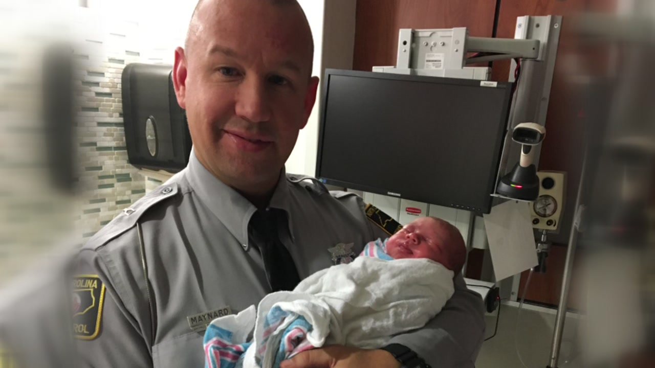 The van was piloted by Jimmy Baker and his wife, Laura, who informed Sgt. Maynard of their reason for speeding. “I was telling them the baby was in my pants and he needed to help me,” Laura Baker told WRAL. Sgt. Maynard called for an ambulance, but unfortunately, the baby was a bit impatient. “The labor came so quickly that (we knew) they weren’t going to be able to make it,” Maynard said.