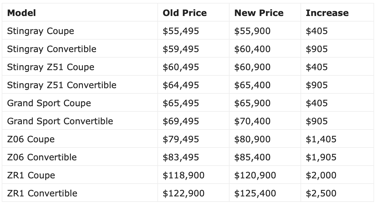 Documents from Kerbeck Corvette showed the new base pricing for the upcoming model line before Chevrolet even listed the info on its own site. The increase starts out at $405 for the base model Stingray coupe—changing it from $55,495 to $55,900—while the base model convertible has a $905 increase from $59,495 to $60,400.
