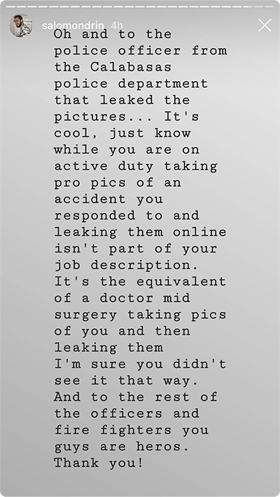 Salomon does confirm the fire in his Instagram story where he attributes the leaked photos to an officer from the Calabasas Police Department who responded to the scene. Two other videos reportedly posted by an Instagram user who is believed to be the originating officer can be seen on Reddit and Streamable. Salomon makes it a point to forgive the officer while reminding him that leaking photos online “isn’t part of [his] job description” and specifically thanks all other first responders for aiding in the fire. No injuries have been reported at the time of writing.