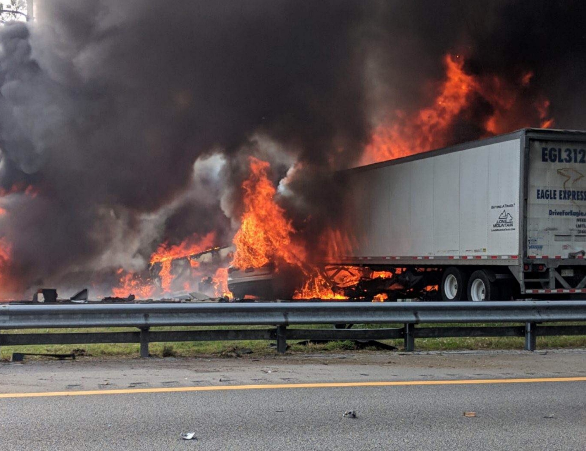 The fire department was able to extinguish the fire after several hours but not before the intense heat damaged some of the pavement. In addition to the extensive damage caused by the fire, vehicle parts and personal belongings were scattered across the interstate and shoulder. A search helicopter was called in to attempt to locate victims who may have been thrown from the scene into nearby woods.