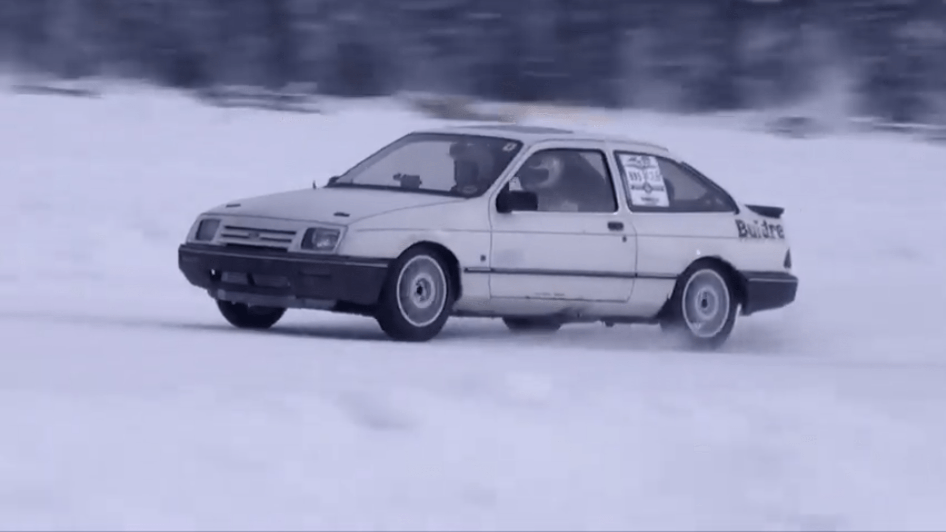 The result is the Sierra rocketing to an average speed of just a hair over 175 mph on this drag strip of ice. That’s a lot faster than any Ford Sierra was ever intended to go, but it looks like it handles that speed like a champ. We don’t know the specifics on what modifications were made to this Sierra other than the upgraded intercooler that’s clearly seen hanging off the front of the car and presumably a revised twin-turbo setup. Oh, and of course, snow tires.