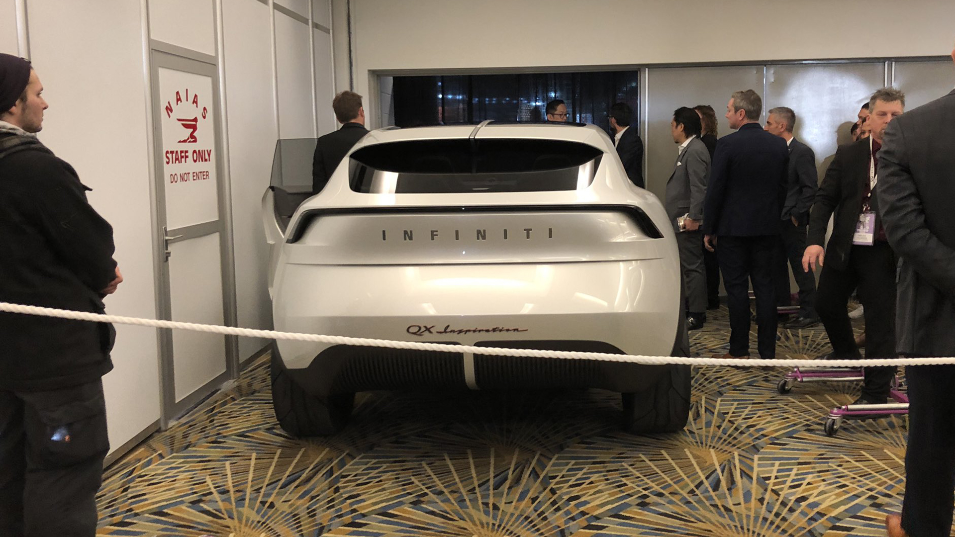 A sizable crowd of journalists had gathered ahead of the planned 11:40am event, which had been scheduled to also coincide with the marque’s 30th anniversary. In a bit of theater, Infiniti arranged to have a technician drive the QX Inspiration on stage for its grand reveal.