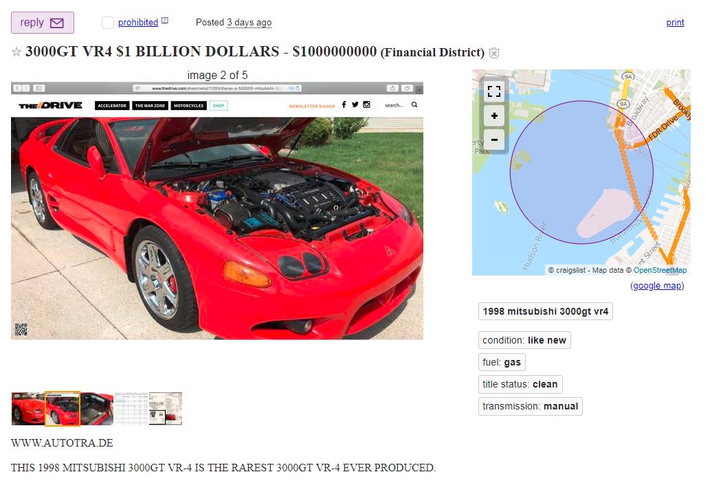 Welp, it looks like our favorite overzealous Mitsubishi salesman is back at it again, peddling what appears to be the same 3000GT now for the low, low price of $1 billion. In a Craigslist post that features a cameo from this very site, the red Mitsubishi two-door is touted to be “THE RAREST 3000GT VR-4 EVER PRODUCED,” a viral internet sensation, and appears to be located somewhere in the Hudson River.