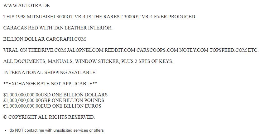 Sometime in 2017, we reported on a 1998 Mitsubishi 3000GT VR-4 that was put up for sale on Craigslist for an absurd $500,000. Seemingly in response to the attention it was getting from the automotive press, the seller subsequently upped the price on that posting to $1 million and later, $10 million.