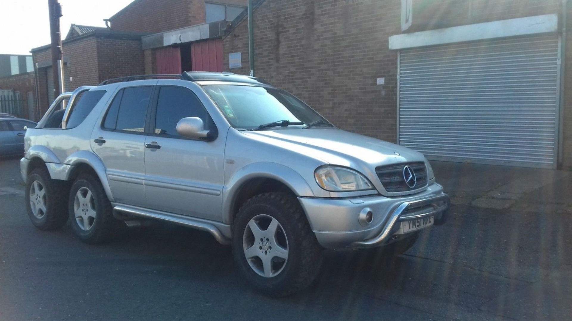 Enter this right-hand-drive 2001 Mercedes-Benz ML currently listed on eBay UK for £19,995 (Approx. $25,000). The SUV’s frame has been stretched to make way for a third axle, as well as a short pickup bed extending past the vehicle’s rear hatch. A bumper bar installed on the ML’s tailgate also holds a full-sized spare tire.