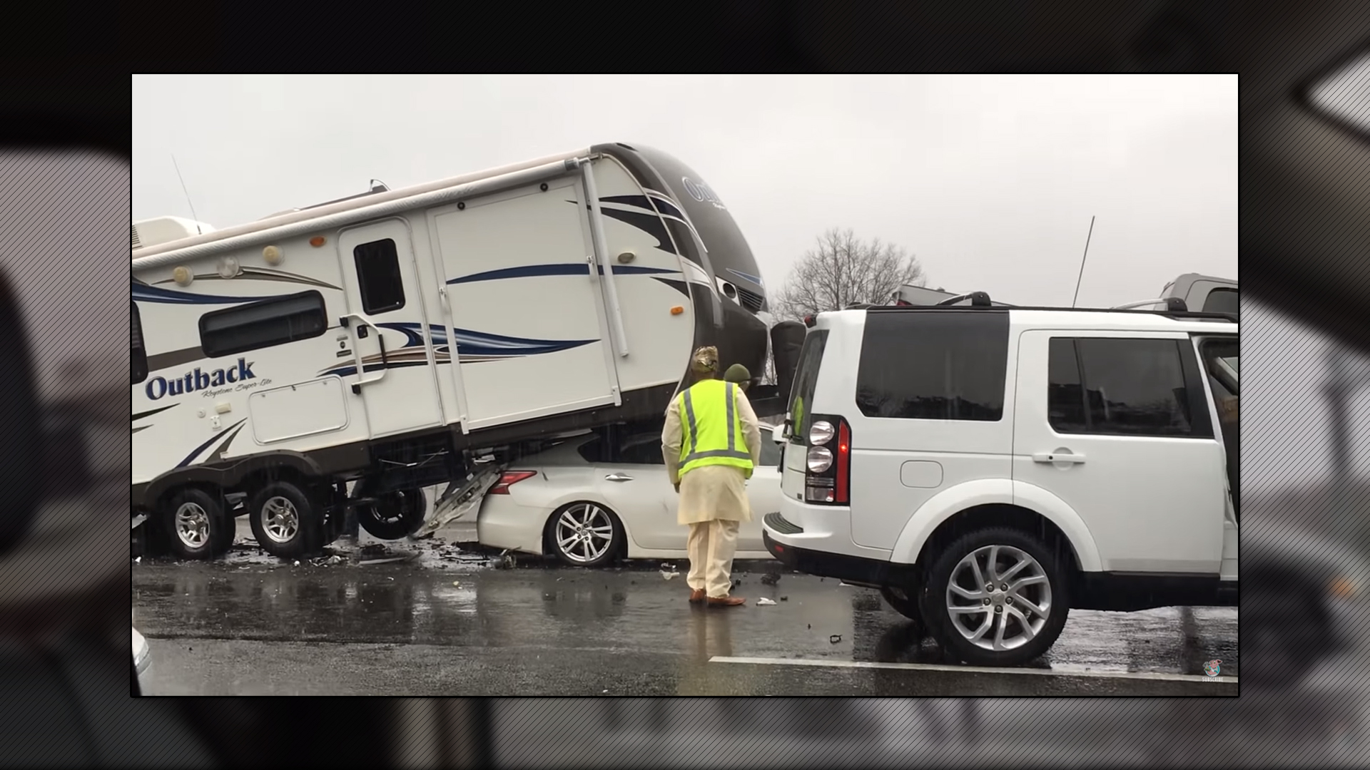 “The car hit the truck pulling an RV trailer from behind. It drove under it all the way to under the truck’s back axle,” reads the YouTube description. “No one was hurt. My son, who’s in the Navy and is a Seabee stopped right away to see if help was needed. The lady was still stuck inside. I believe she crawled in the back seat and got out the opposite side back door. No one was injured.”