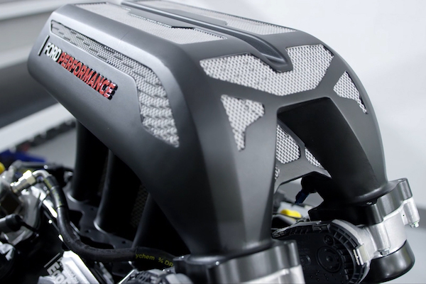 By gradually adding aluminum over a period of five days, layer by tiny layer, Ford built up the complex, six-kilogram (13.2-pound) part, which juts up from the Hoonitruck’s low hood, the crown jewel of the engine.