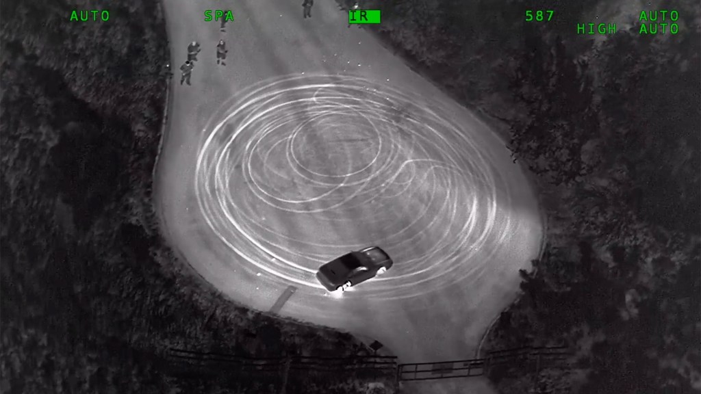 The CHP triumphantly uploaded aerial video of the operation to one of its Facebook pages last week, presenting it as proof the department is cracking down on sideshows, street racing, and general automotive hooliganism. The infrared footage shows a small group of people watching a single car spin in a nice controlled circle in the middle of the night. Honestly, it makes the donut look pretty cool, as any infrared footage of burning rubber tends to do.