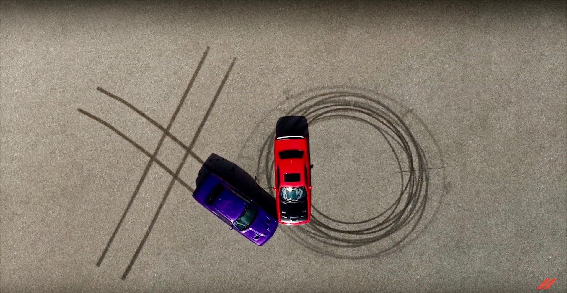 After a few more seconds of the Challengers swinging their rear-ends around while carrying a couple of roses in the rear seats, a birds-eye view reveals what the duo has been up to. In previous years, Hellcats have “drawn” anything from hearts to cupid arrows with their rear tires, but this time it’s an “X” and an “O.” As in XO, which is text code for hugs and kisses. Aww…