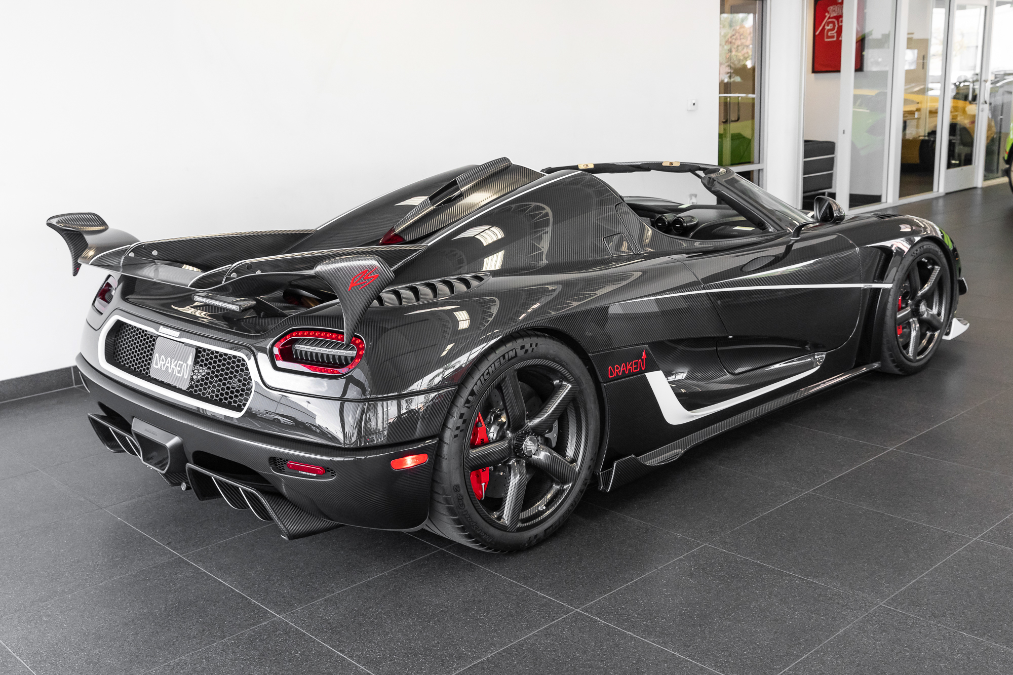 In addition to its definitive paint scheme, Draken features a bevy of carbon fiber extras, including a carbon front splitter, side skirts, rear diffuser, spoiler, and much of the cockpit. It’s also equipped with the 1 Megawatt package, raising the twin-turbocharged V8’s powers from 1,160 to 1,341 horsepower. You can find the car’s signature on both flanks of the exterior, stitched into the black Alcantara seats, and on the car’s custom license plate.