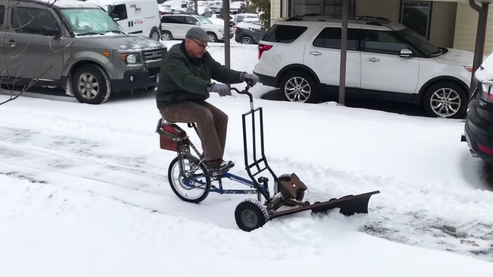 “The bike plow came about because I hate shoveling snow but love riding bikes,” he told USA Today. “Plus, legs are stronger than arms, so a bike plow should be easier to use than a shovel, right?”
