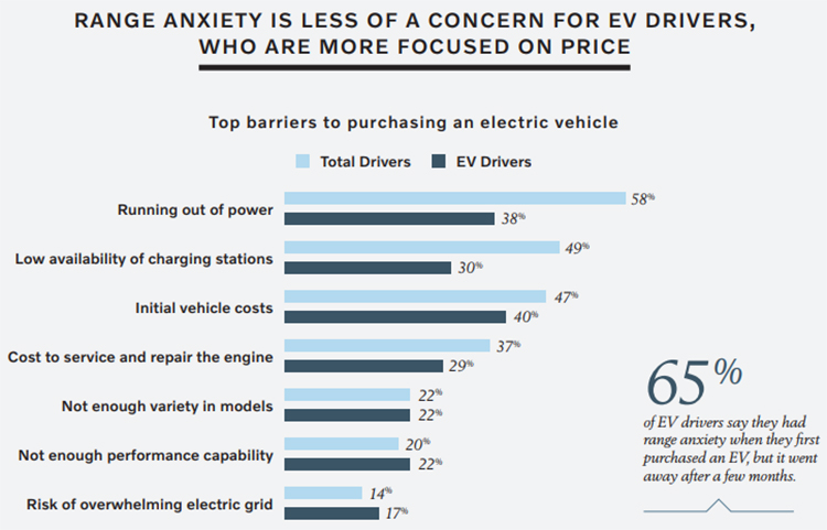 By a margin, the largest reason that consumers have avoided purchasing an electric car is range anxiety. That is, 58 percent of drivers are afraid that they will run out of power before being able to charge their vehicle, while another 49 percent fear the low availability of charging stations.