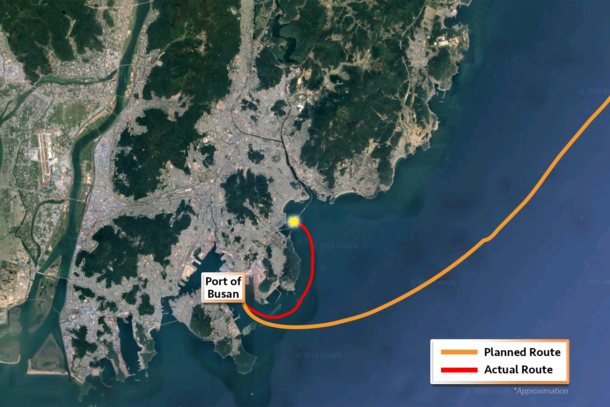 According to Yonhap News, the 370-foot Seagrand had arrived in Busan on Wednesday and set out for its home port of Vladivostok, Russia carrying nearly three million pounds of steel coils when the accident occurred. The map shows it should have sailed north along the coast before making its way across the eastern edge of the Sea of Japan.
