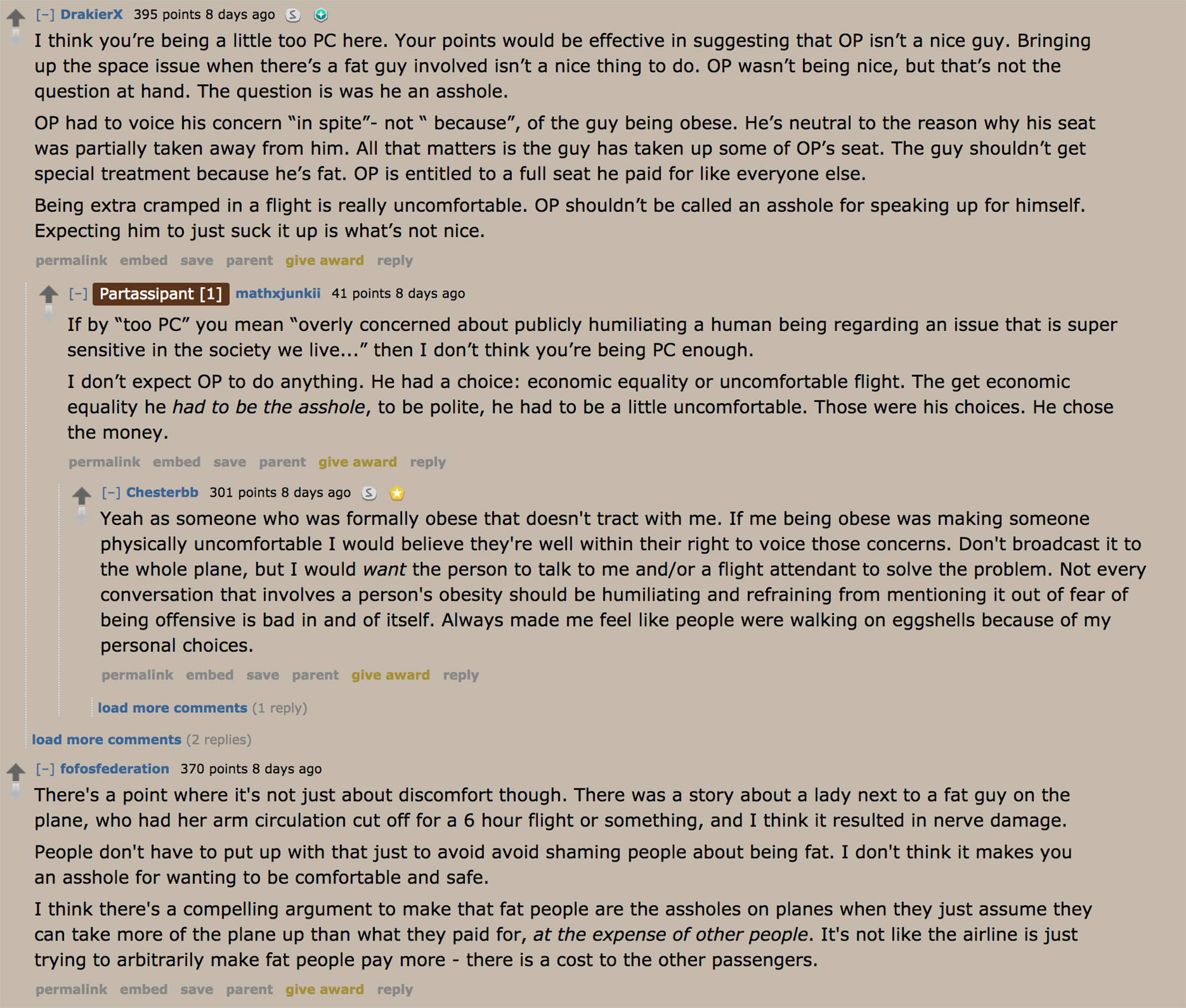 But there’s also a sizable, vocal minority going point by point to defend the complainant’s right to his full seat. It wasn’t a demand—it was an offer. It wasn’t a public humiliation, but a fair negotiation between two people arbitrated by an airline employee. It wasn’t either of their faults, really—it’s the airlines pitting us against each other to save money. Their general view is that while it may have been a little impolite, it certainly wasn’t mean.