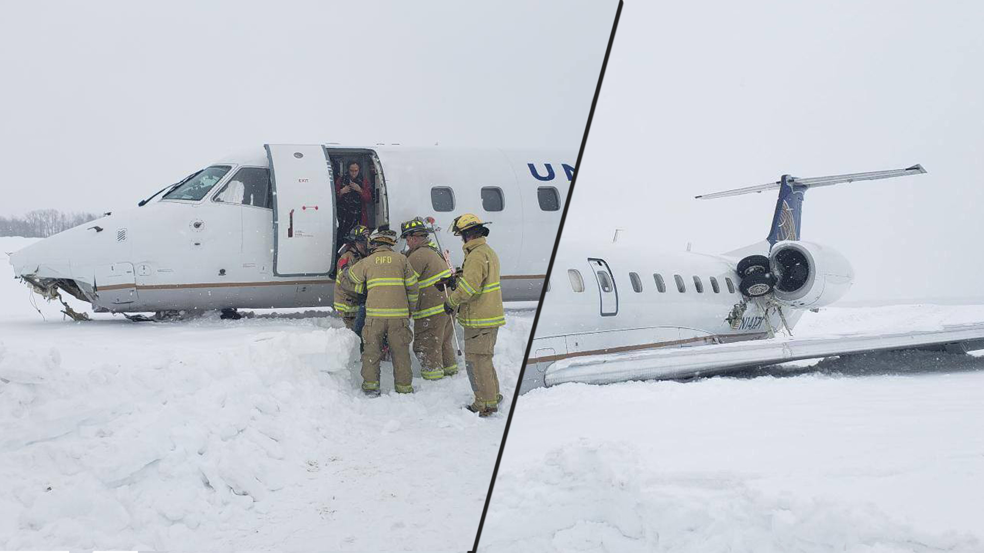 Pictures posted to the Crown of Maine Facebook page show the crashed Embraer in vivid detail, lying flat on its belly on the snow. One image shows what appears to be fire fighters from the Presque Isle Fire Department aiding individuals off the aircraft, the damaged nose of the commuter jet clearly visible; the second shows the rear of the plane, with one set of the rear landing gear jammed up against the port side engine several feet above the ground.