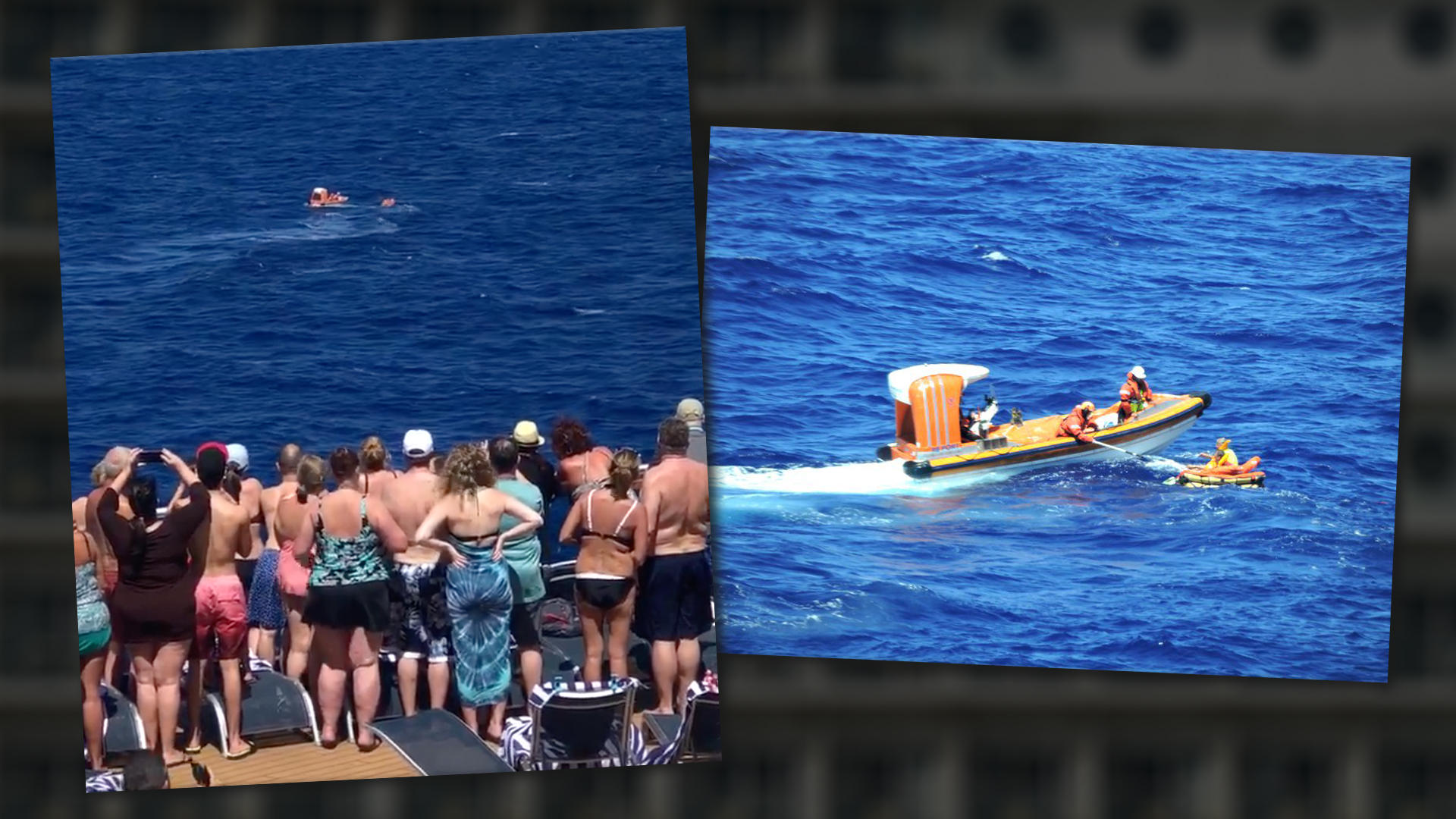Eventually, a Coast Guard plane spotted a tiny, inflatable life raft with two survivors on board bobbing in the waves and directed the Regal Princess to its exact location. A video recorded by a passenger shows curious onlookers crowding the upper decks and balconies to watch and applaud as the ship’s crew dispatches a small dingy and retrieves the men. Another video shows one of the survivors gleefully waving in response.