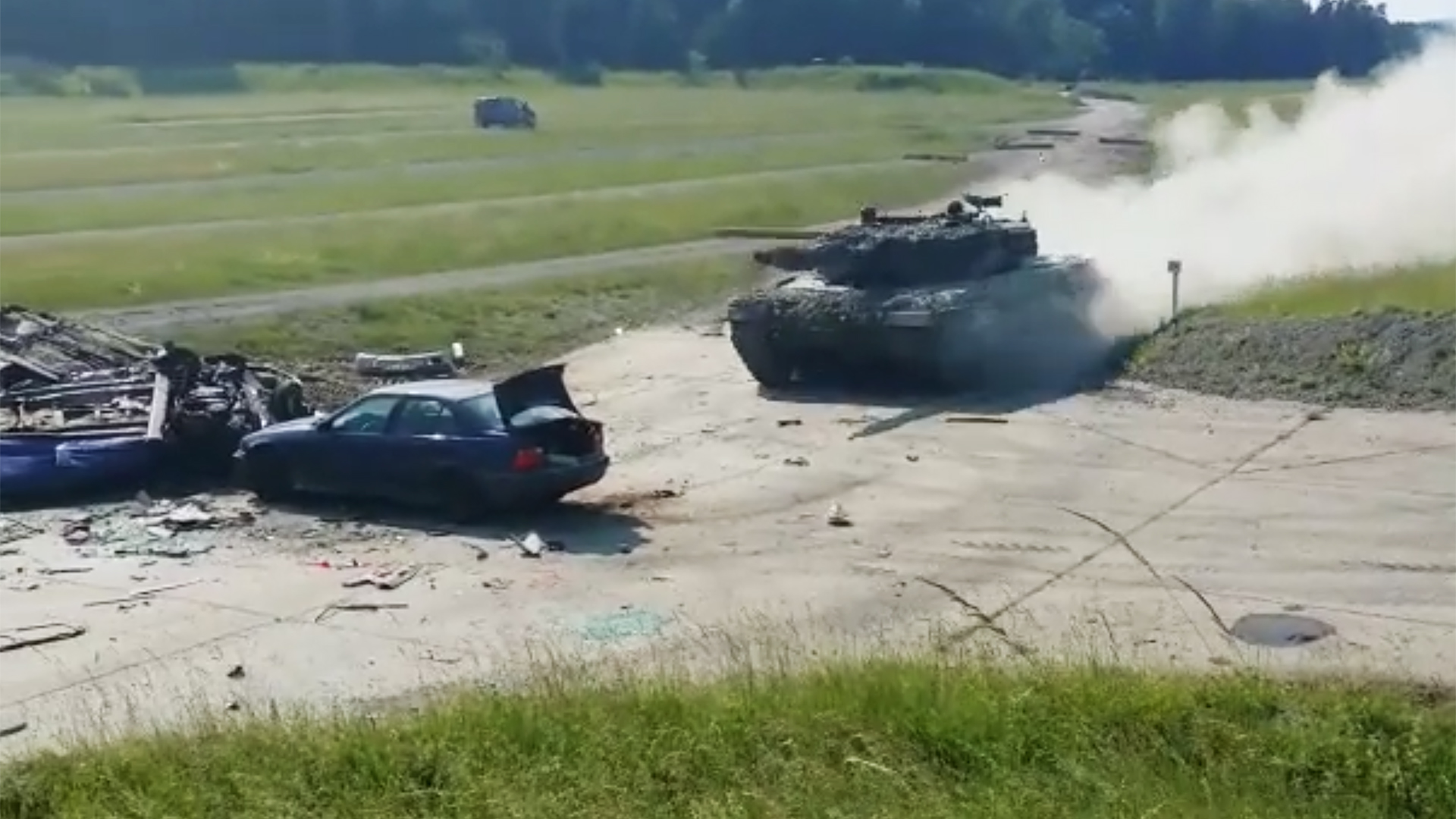 The collision is as brutal as you’d expect. In an instant, the BMW sublimates into a cloud of shrapnel. The impact briefly sends the 136,000-pound Leopard airborne as it flies forward unfazed.