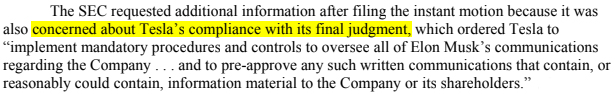 Furthermore, the governmental entity states that it was concerned with Tesla’s compliance in its own final judgment which ordered the automaker to adhere to a policy which would police its CEO’s company-related communications on social media.