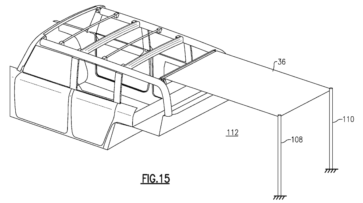 The roof in the patent drawings actually has two layers: one comprised of what’ll likely be a mesh polyester material on top of a secondary cloth part, offering two varying levels of shade and protection for occupants. It could also be entirely dismantled and removed, should drivers want a completely open motoring experience.