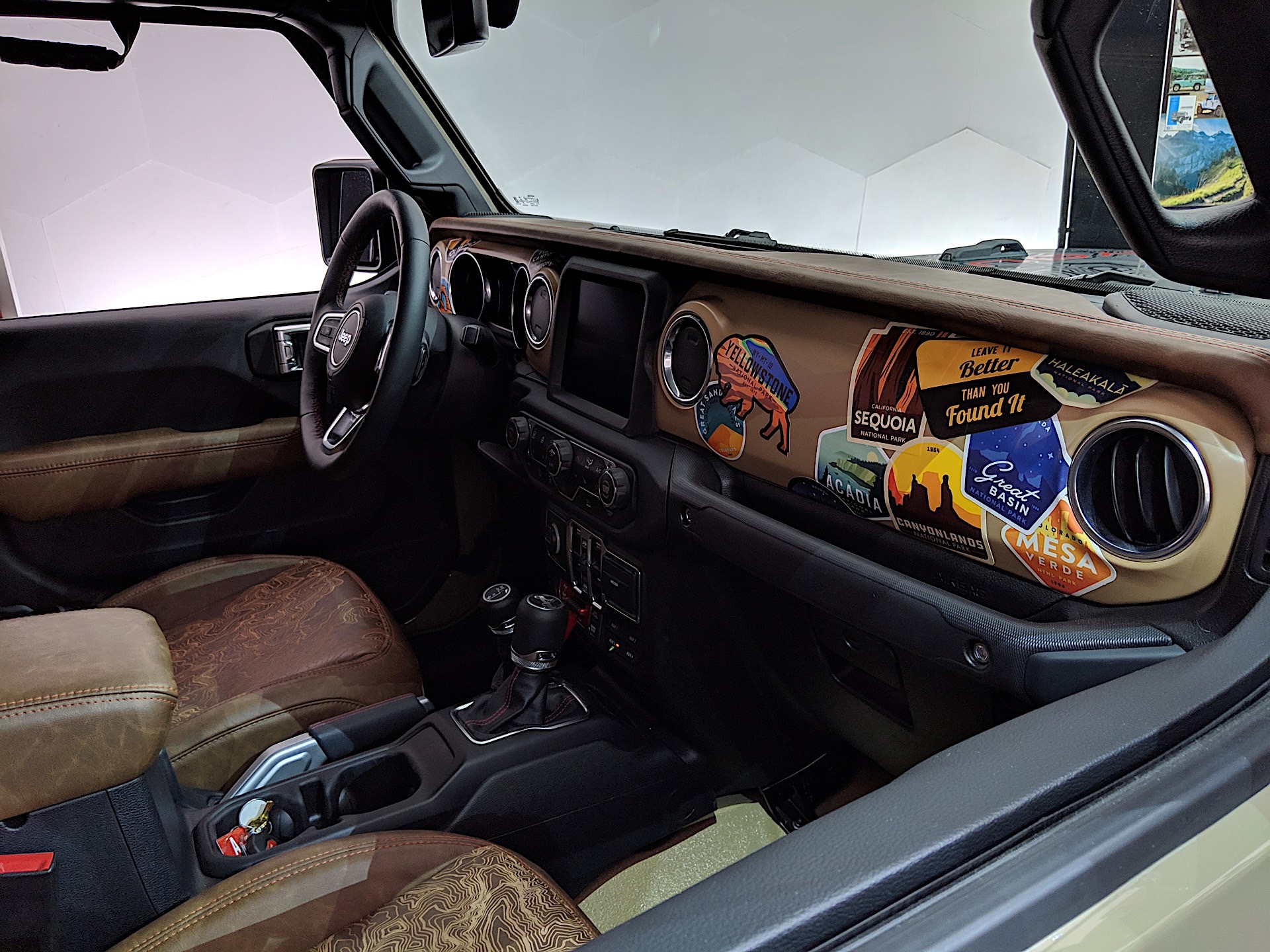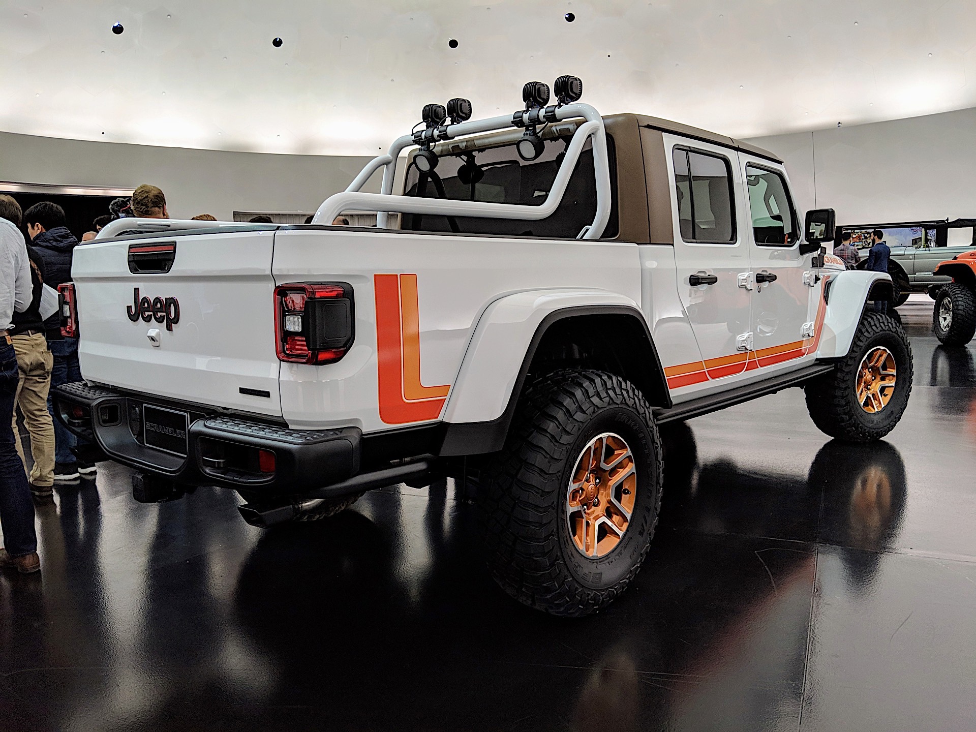 The Jeep JT Scrambler is a delightful throwback to the 1980s featuring the color pallette from the CJ Scrambler along with some modern and concept parts. The hardtop is brown, along with the leather seats, and there are orange accents throughout.