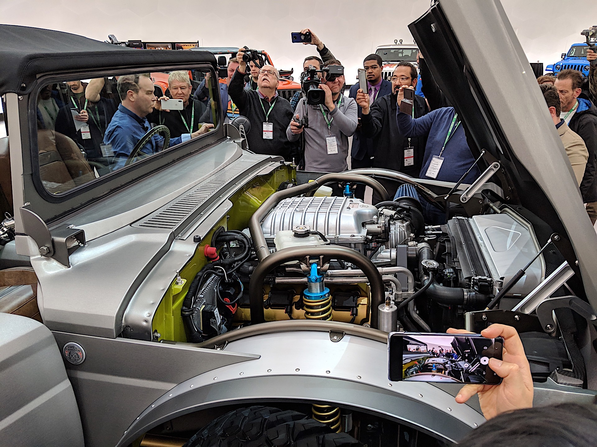 It rides on a link coil suspension system and has rock rails and bumpers modified and brought over from the Gladiator Rubicon to help protect the Five-Quarter off-road. For axles, the Five-Quarter uses a Dana 60 up front and a Dana 80 in the rear. That heavy-duty hardware is present to handle the power, which is a Hellcrate supercharged 6.2-liter V8 making more than 700 horsepower.