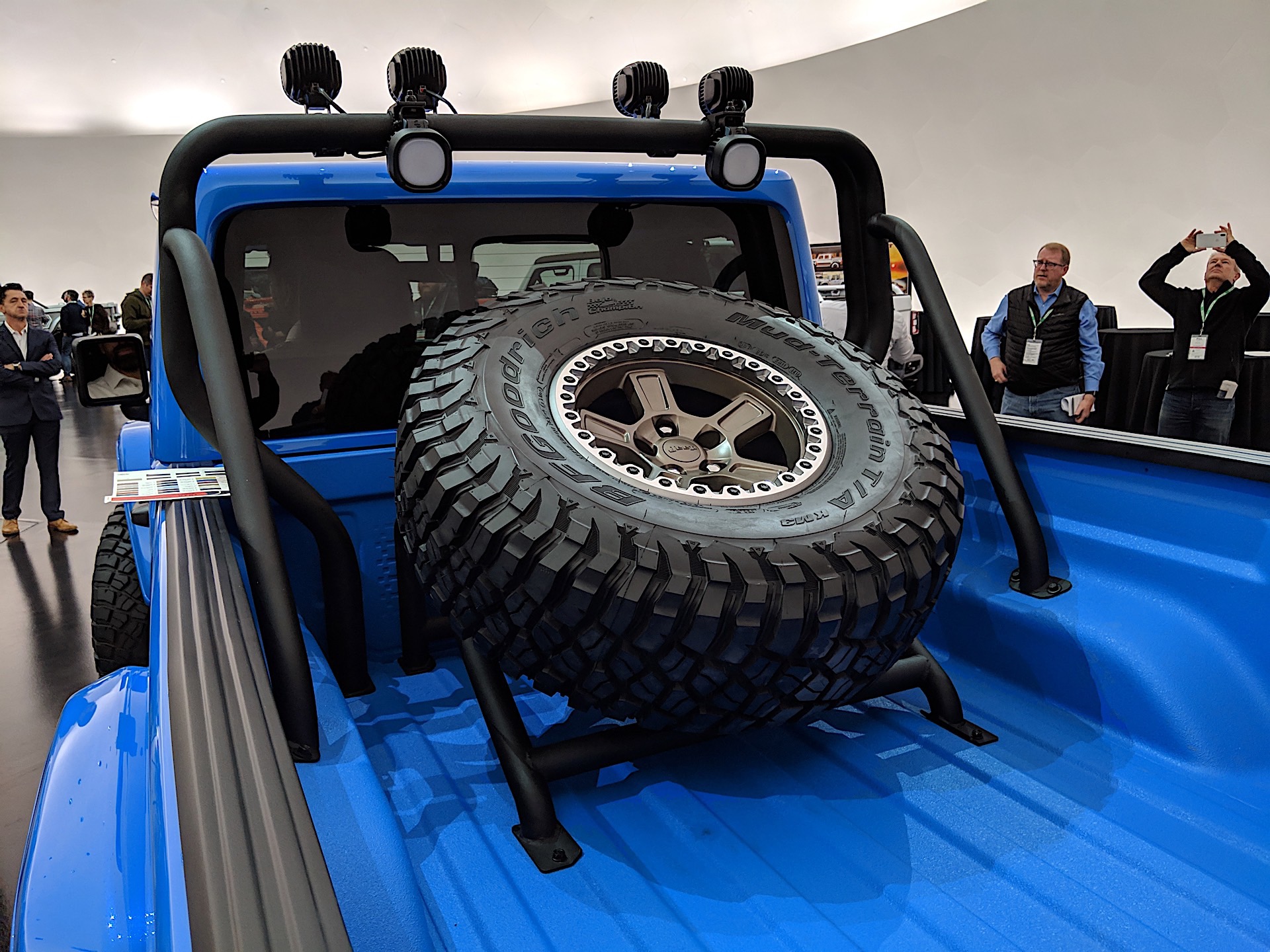 Finally, the J6 concept is a two-door, long-bed Jeep Gladiator. It’s painted in Metallic Brilliant Blue paint (also carried over to the spray-in bedliner) as an homage to the 1978 Jeep Honcho. The wheels are equipped with 37-inch tires, and there’s a concept spare tire holder in the bed. It’s a throwback that we’re sure many Jeep fans would get behind today.