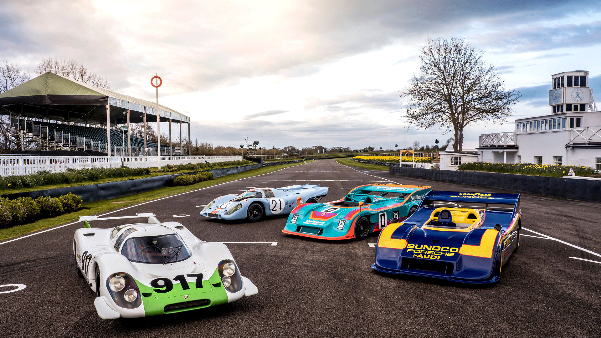 The iconic Porsche 917 is celebrating its 50th anniversary this year and held its birthday bash at Goodwood’s 77th annual Member’s Meeting this past weekend. As Porsche’s first Le Mans winner, the 917 received a special parade around the Goodwood Motor Circuit, where four of the most famous cars in the prototype racer’s lineup set tire on the track once again.