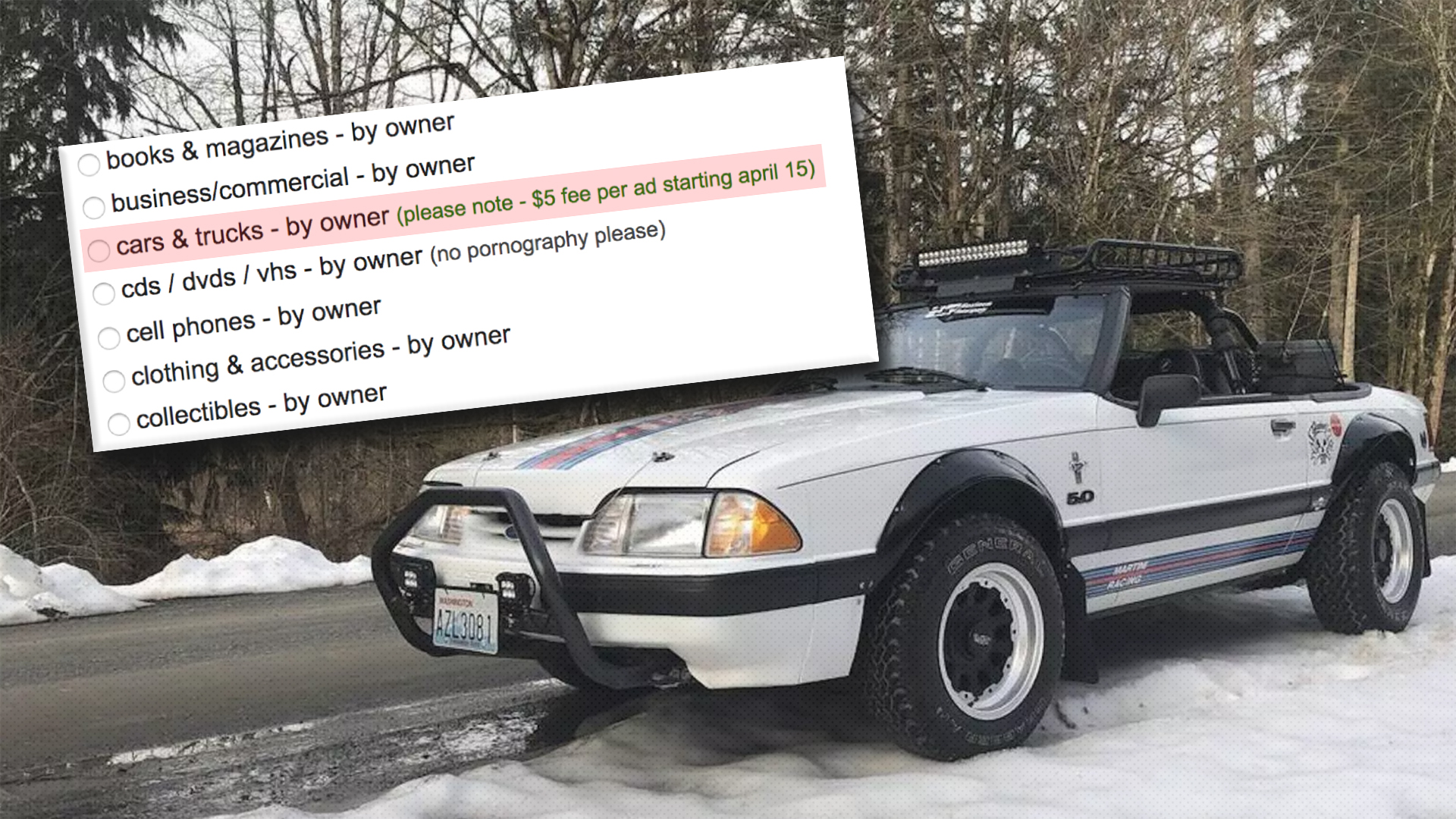 Notable used goods emporium Craigslist.org, long the go-to online home for anyone looking to sell their ruined project car, will be implementing a $5 fee to post a classified car ad beginning on April 15 according to a note on the site’s listings page. It marks the first time in the site’s long run that private parties will be charged for the service—and in some ways, not a moment too soon.