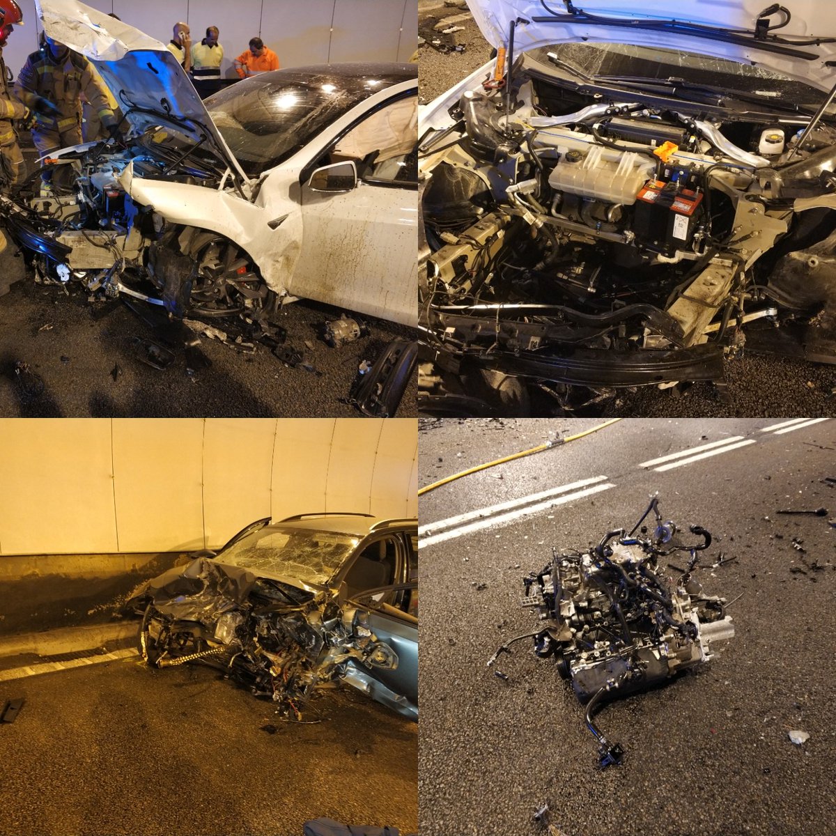 After impact, the electric sedan bounces off the side of the tunnel while the station wagon is flung to the opposing side, highlighting just how severe the impact was. Pictures of the aftermath posted to Forocoches.com show a barely-recognizable, airbags-deployed Model S front-end. The station wagon’s engine was also completely thrown out of the car.
