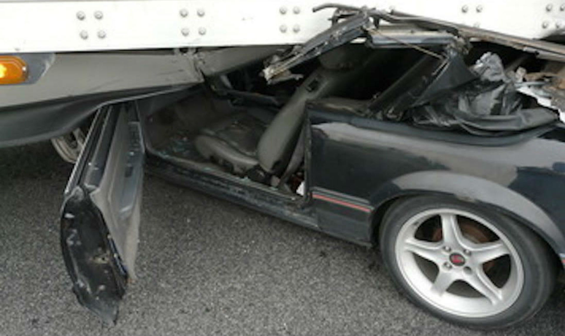 Indiana State Police were notified of a two-vehicle crash that took place on Sunday afternoon involving a 1989 Ford Mustang and Volvo semi truck in which the driver of the former lost control and was pinned underneath the 18-wheeler. The sports car was smashed by the tractor-trailer and dragged a half-mile before the semi driver noticed and subsequently stopped on the highway.