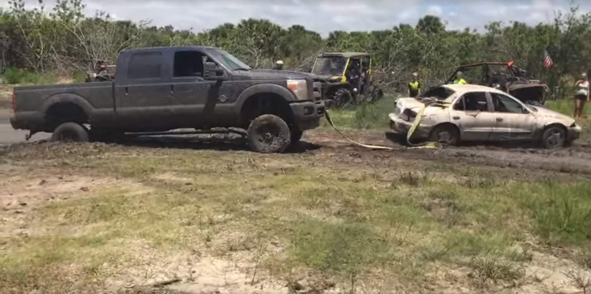 Details are sparse, but it appears the F-250 was four-wheeling with a bunch of truck owners along a powerline trail somewhere in Florida. While trying to traverse a mud pit, the F-250 found a way to get its rear drive axle stuck in the mud pit. That’s when the Cavalier sedan supposedly stepped in with a tow strap and friends began recording the hilarity that ensued.