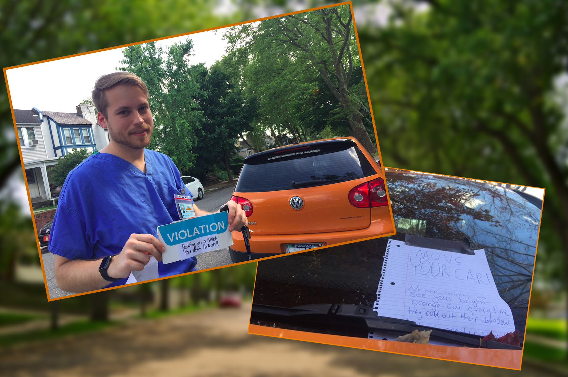 Korey, the owner of the GTI who lives in Philadelphia’s East Falls area, one day came back to his parked car with a note tacked onto it reading: “MOVE YOUR CAR! No one wants to see your bright orange car every time they look out their window. Park on another street. You have no right to park here.”