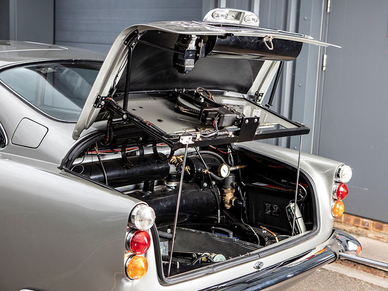 This particular unit is not a modern recreation. It’s one of four cars purchased by Eon studios following the launch of the third Bond film, Goldfinger. Under its three caretakers, the DB5 has since been restored back to silver screen specifications by the restoration experts at Roos Engineering, a shop which is one of just 13 Aston Martin Heritage Specialists around the world. And in typical Bond fashion, the restoration also included fully functional special effects gadgetry.
