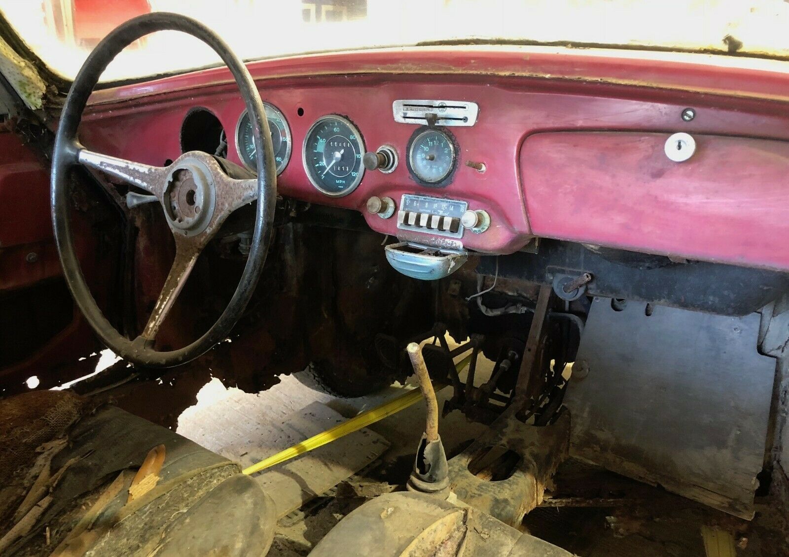 It originally sold in Ruby Red, though you’d never tell with how weathered and corroded the exterior is. The interior, or what’s left of it, also originally came in black. You can see hints of it here and there, but peer through the listing’s photos and it gets even worse.