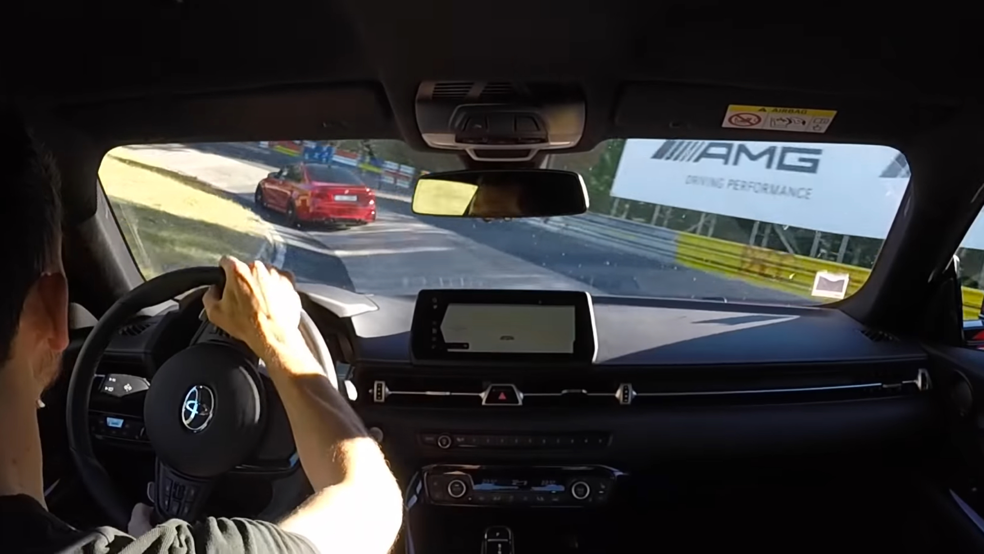 A motorcycle on the ‘Ring is no joke, especially on some of the circuit’s faster straights. Likewise, the 425-horsepower F80-generation BMW M3 the Supra dices with later in the video is a vehicle all but built for the Nürburgring’s twisty Nordschleife course, so passing it is no joke.