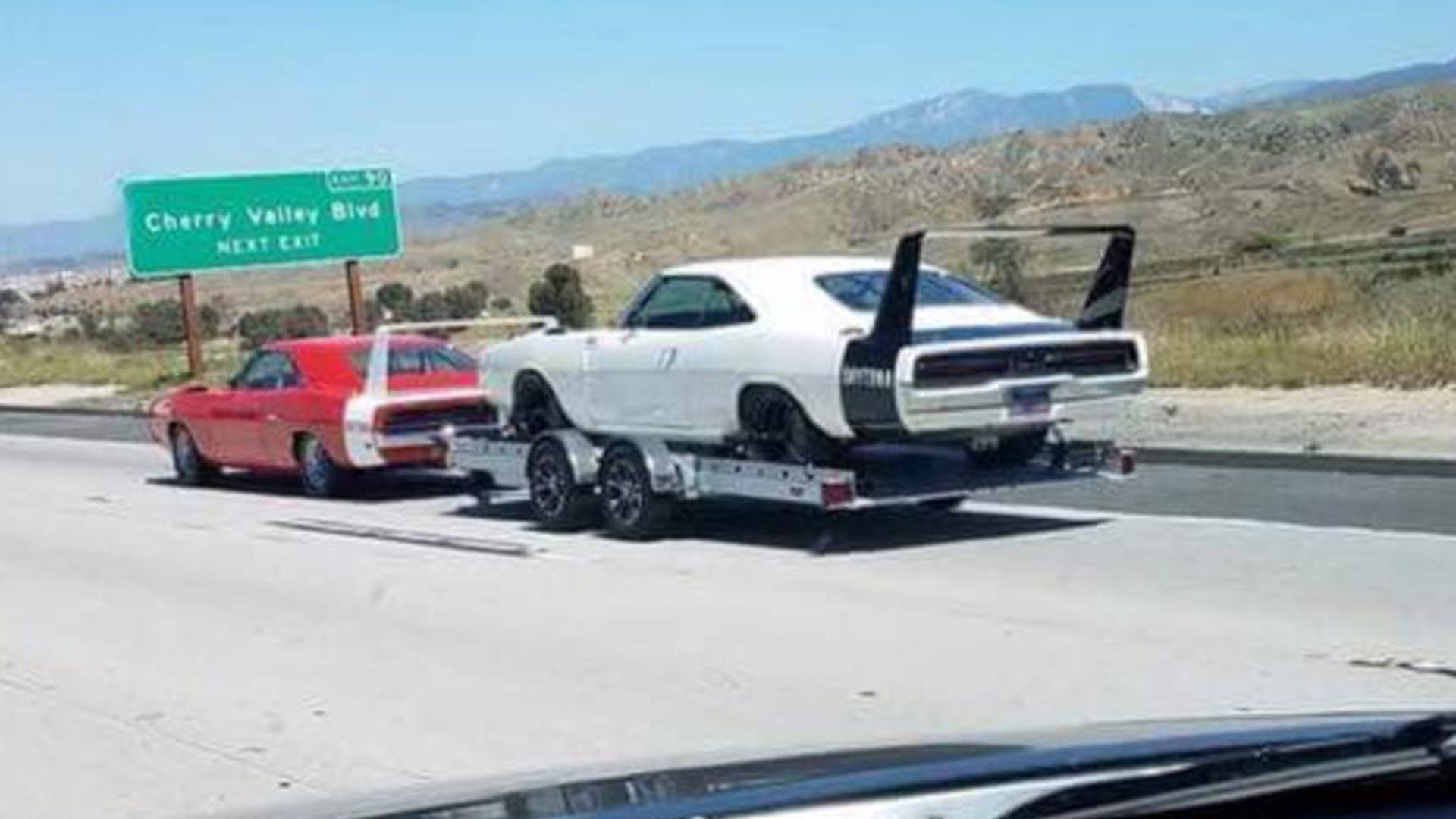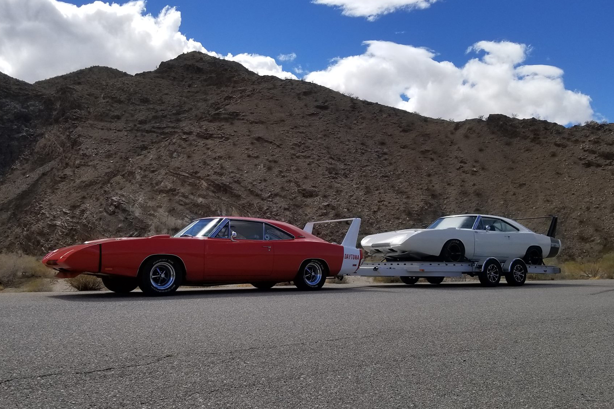 A picture of the southern California resident using his 1969 Dodge Charger Daytona to tow a second Charger Daytona popped up on Facebook earlier this month with the simple caption “America” and immediately sparked a frenzy—and some blazing questions. Who was this mystery man trundling down the highway in a patriotic tableau? Are those real ’69 cars? Why don’t more people enjoy their pricey things with such abandon?