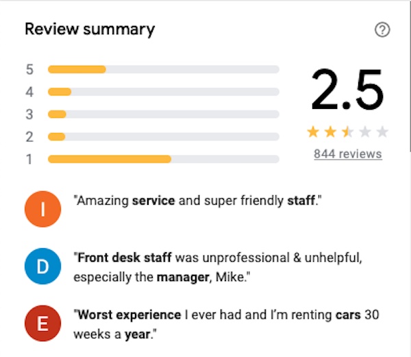 Mann isn’t the only person to use the S-word in his comments on this Ace Rent A Car location. Reviews online make alarming use of the term, with two of the business’s 20 Yelp reviews claiming such practices, and another accusing it of “classic bait and switch.” Google reviewers commonly ding the location for poor customer service and leave one-star reviews at a far higher rate than any other. Of the location’s 844 reviews, 27 cry “scam,” and six report bait-and-switch activity.