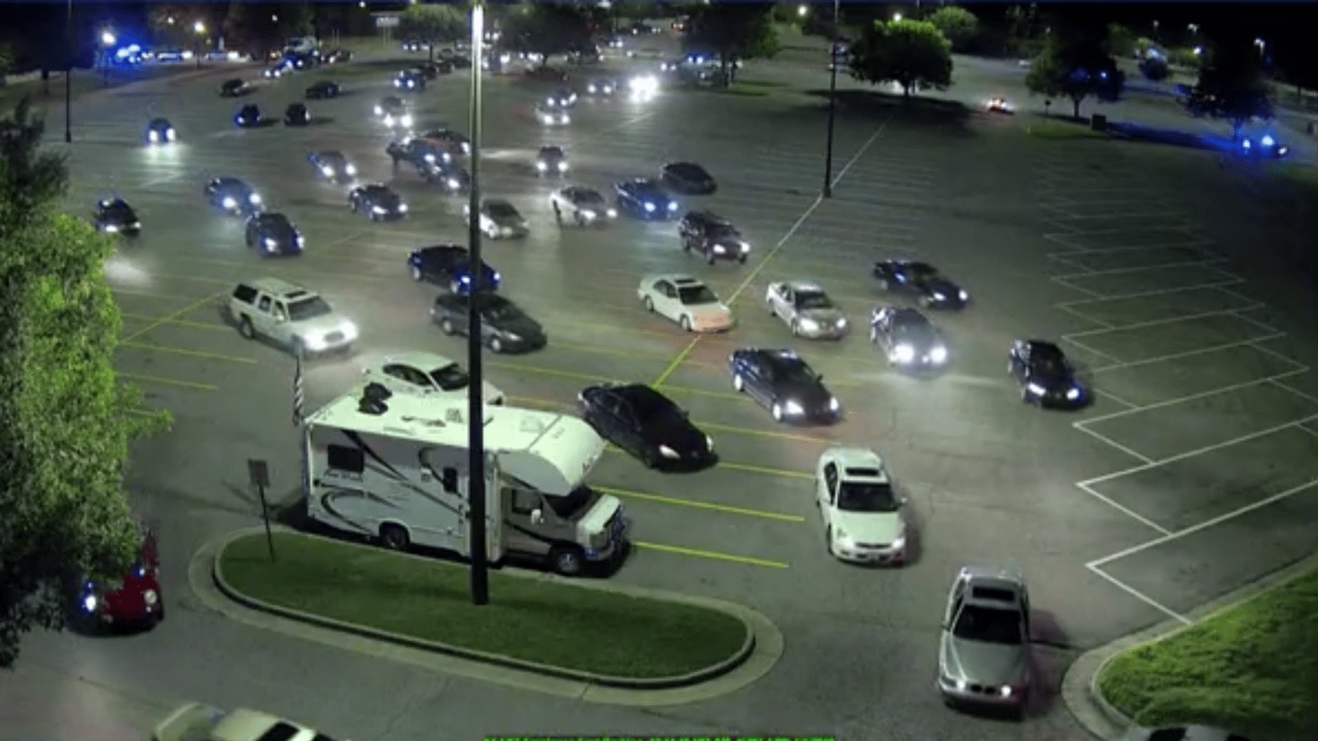 Surveillance camera footage taken outside of a Columbus, Georgia civic center shows the results of a massive police raid on a group of crazy-driving hooligans. In a view of the building’s parking lot, we see police systematically blocking and lining up the cars, whose drivers are accused of everything from driving drunk to riding on the tops of moving vehicles.